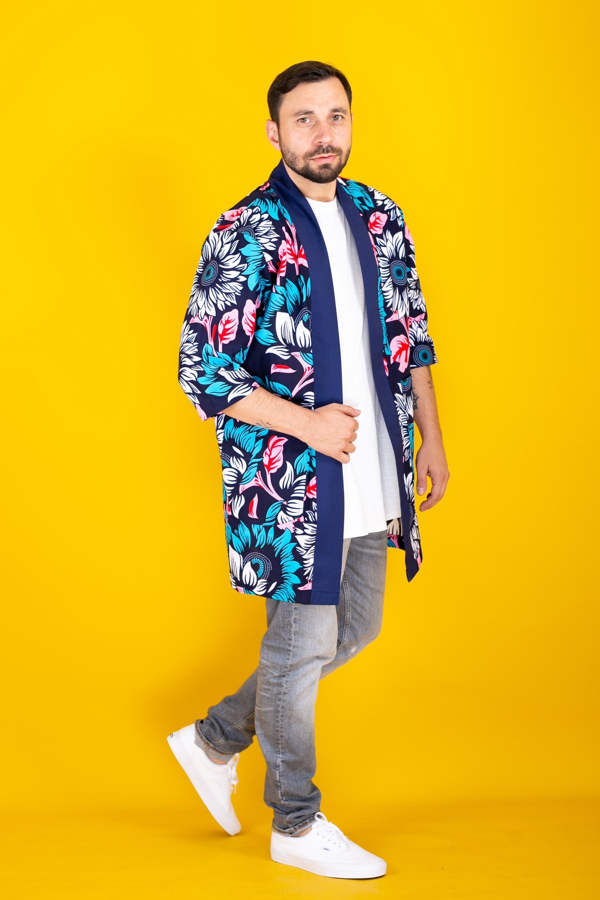 White mature man wearing sunflower kimono